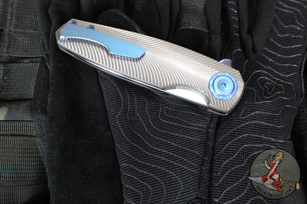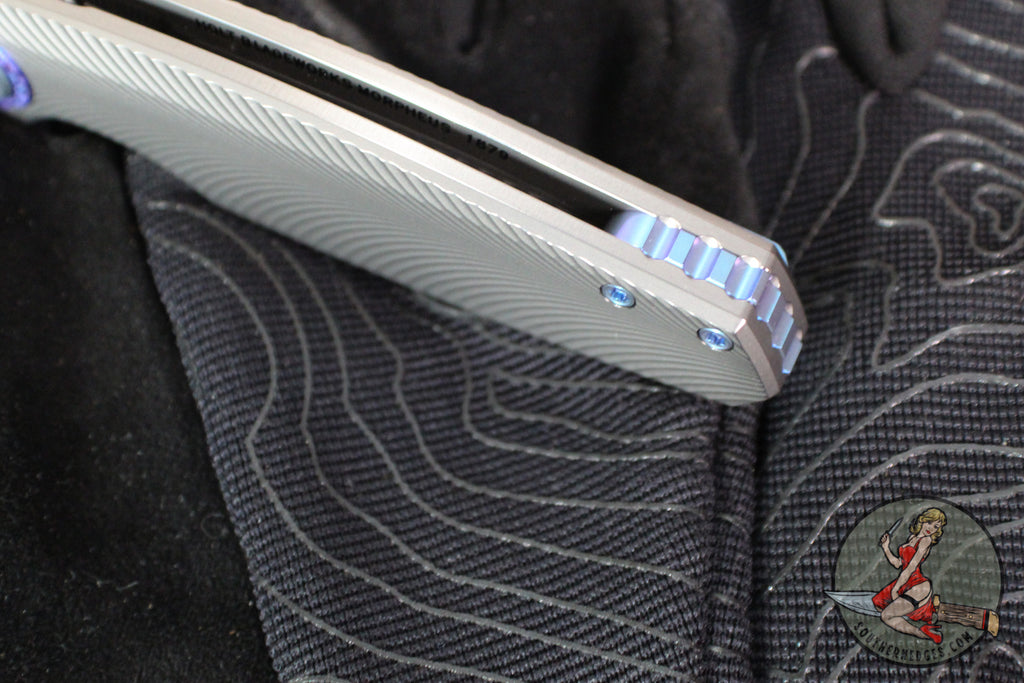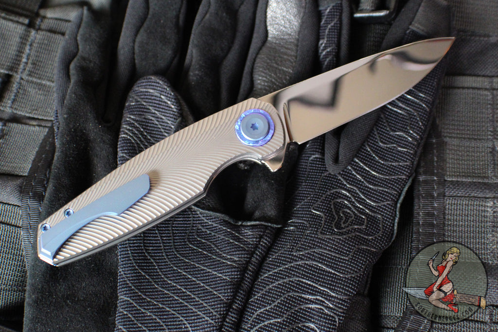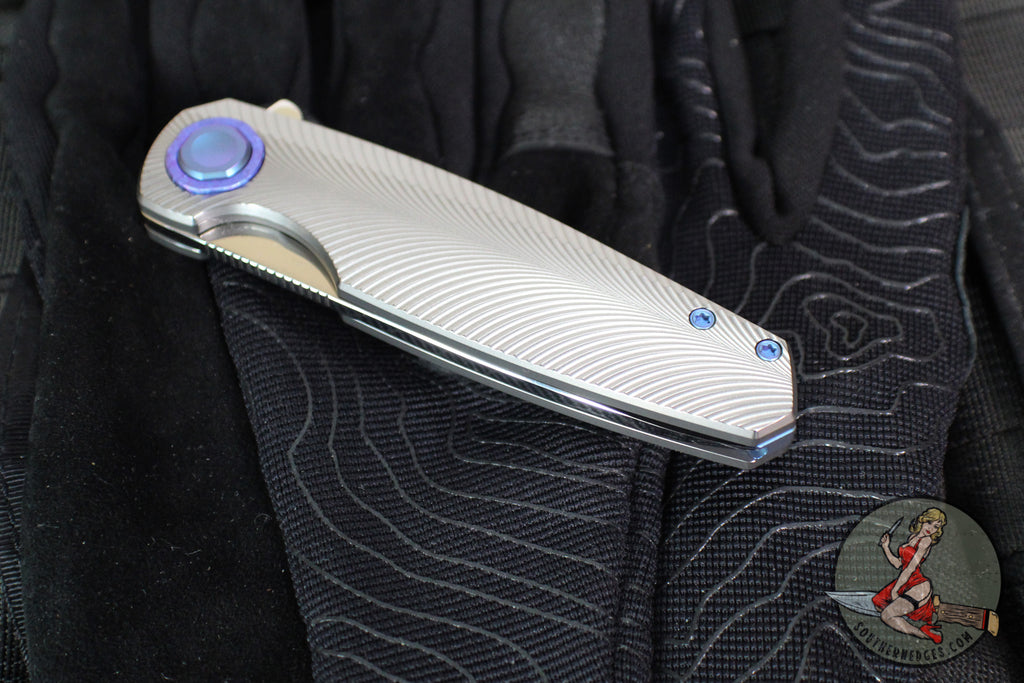 Holt Bladeworks Morpheus Flipper- Feather Pattern Titanium- Burnished In The Nude Titanium Handles- VANAX Near Mirror Blade Finish SN1879
