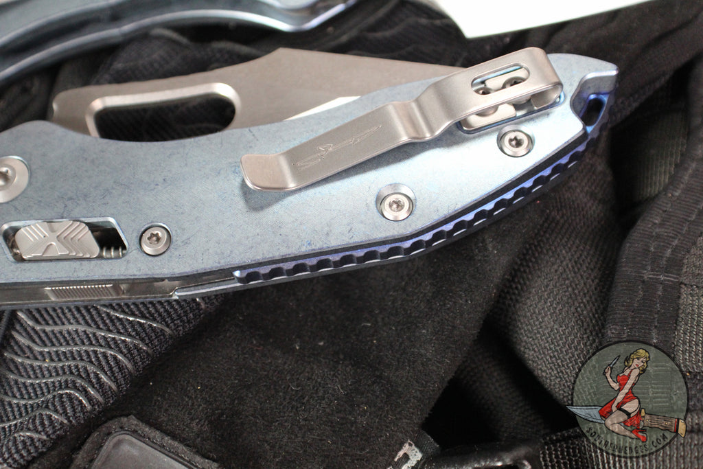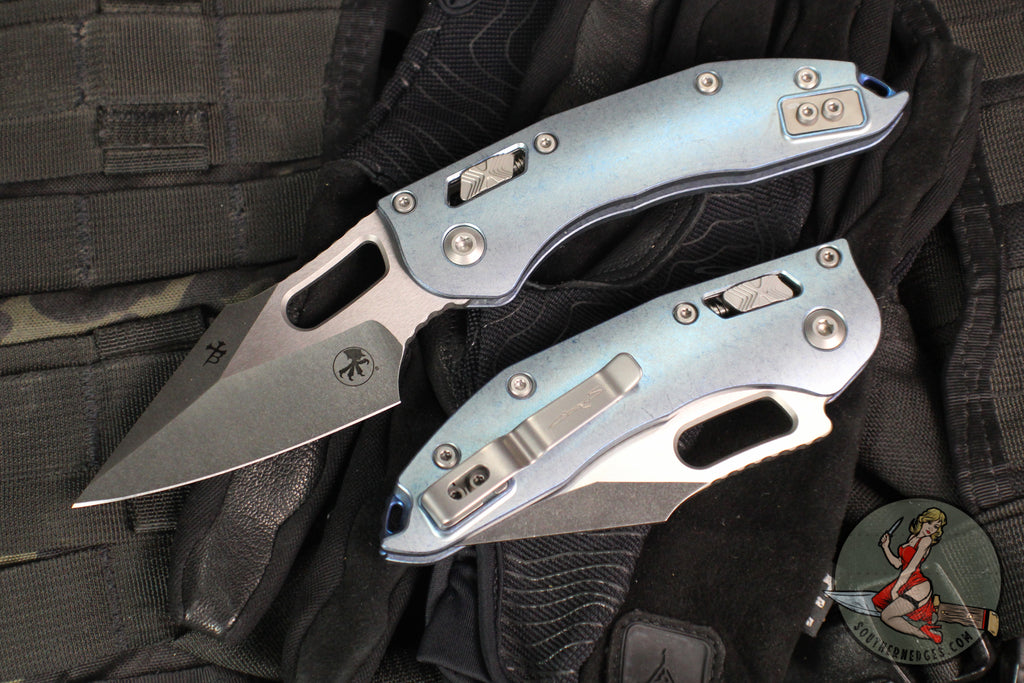 The Microtech Stitch is a production version of the Custom knife collaboration between Marfione and Borka Blades in the new Ram Lok format. Ice Blue Anodized Smooth Titanium handle and Stonewash finished M390MK steel blade. 3.75" Blade, 8.5" overall. Tip up carry. Side opening blade.