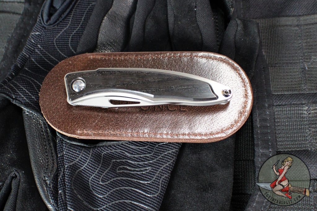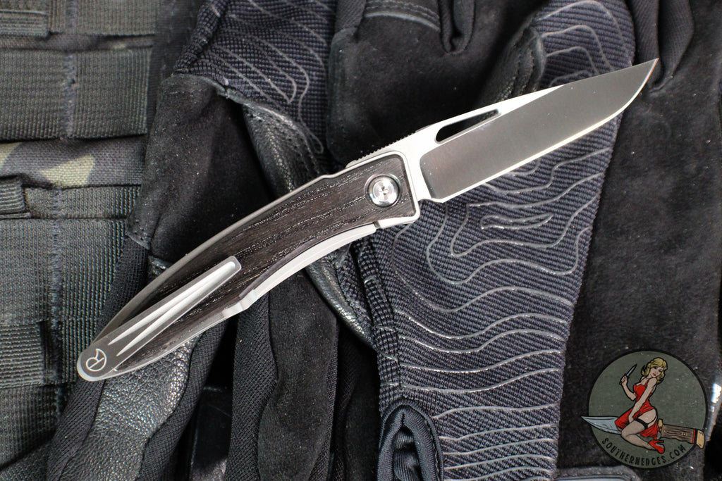 Chris Reeve Mnandi Model, a sleek compact folder perfect for carry. Titanium 6AL4V Handle that has been fully pocketed by Bog Oak Wood. Stonewashed drop point blade in Magnacut steel.