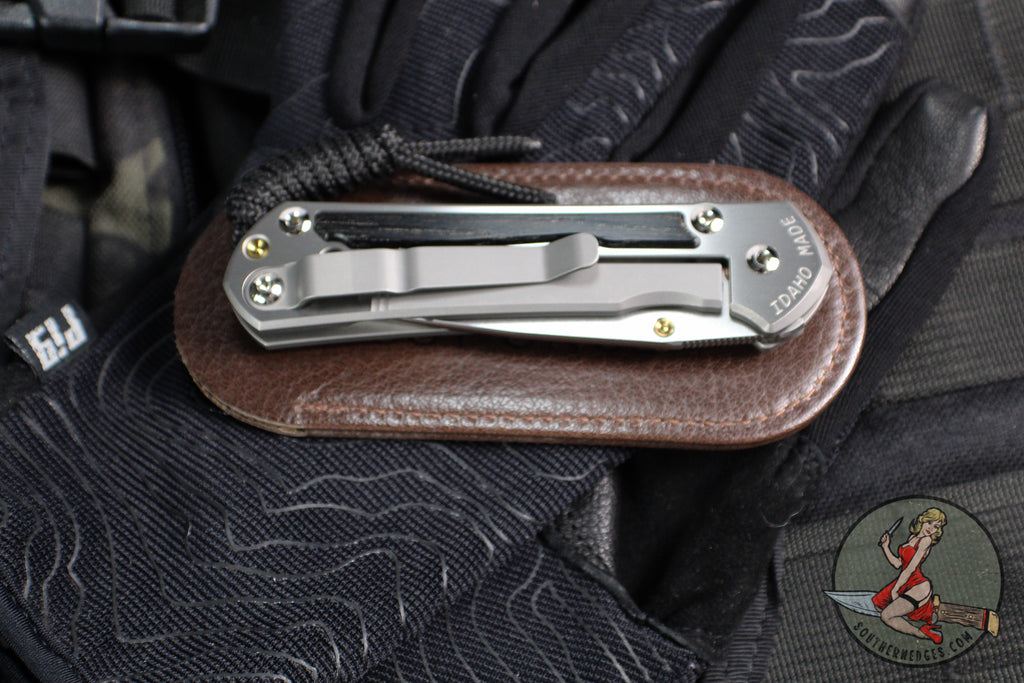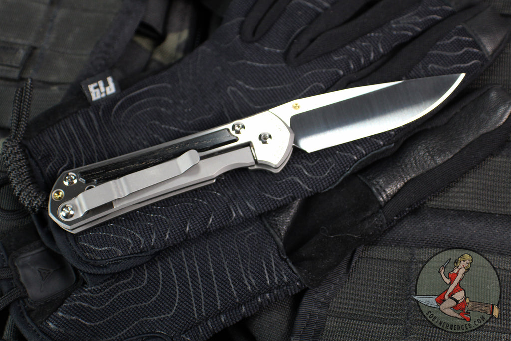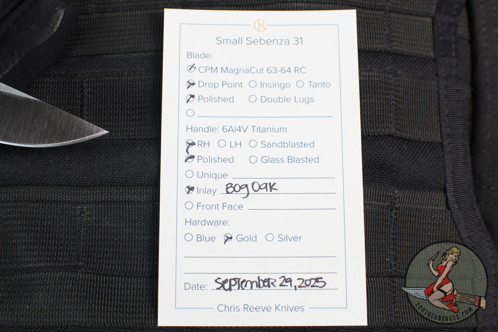Chris Reeve Classic Sebenza 31 Small Model. Titanium 6AL4V Handle that has been sandblasted to a dark gray color except on lock and clip.  Bog Oak Inlay and the polished drop point blade is in Magnacut