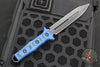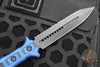New Large Heretic Nephilim Double Edge Fixed Blade Dagger. This model features a Battleworn Black finished Elmax Steel blade. Blue/Black G-10 Scales and Sheath as shown.