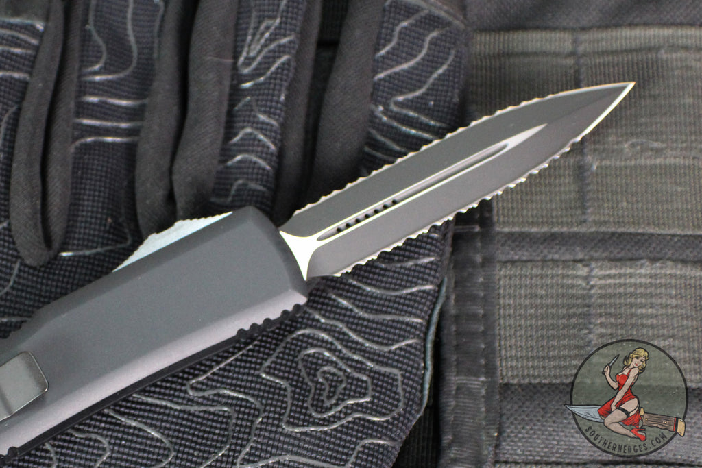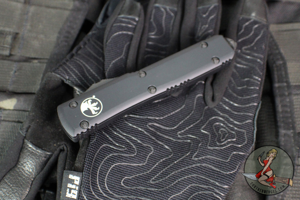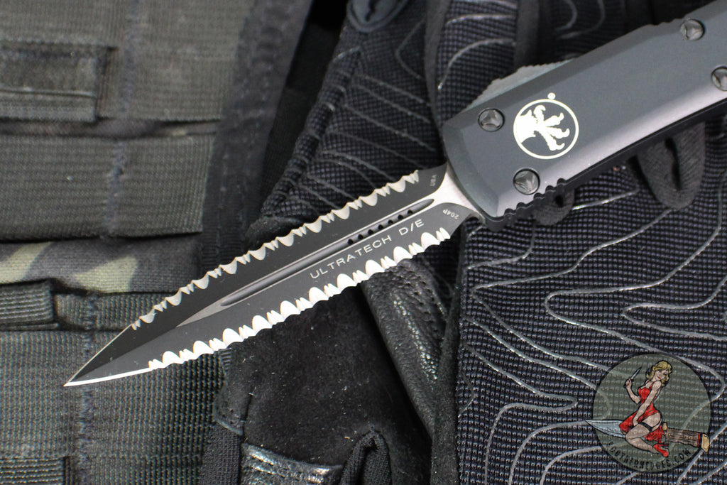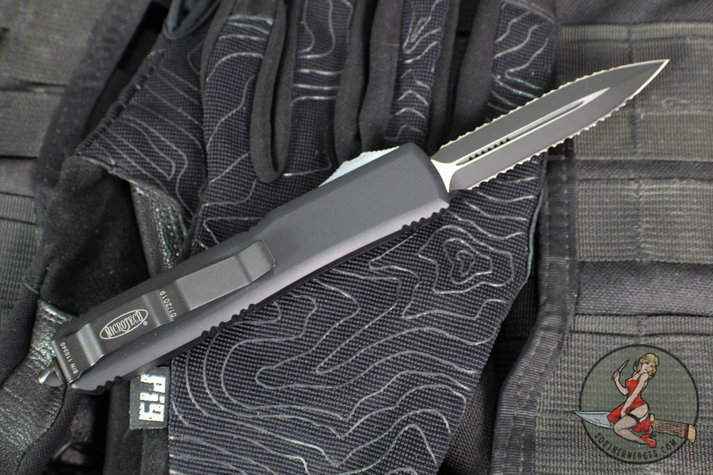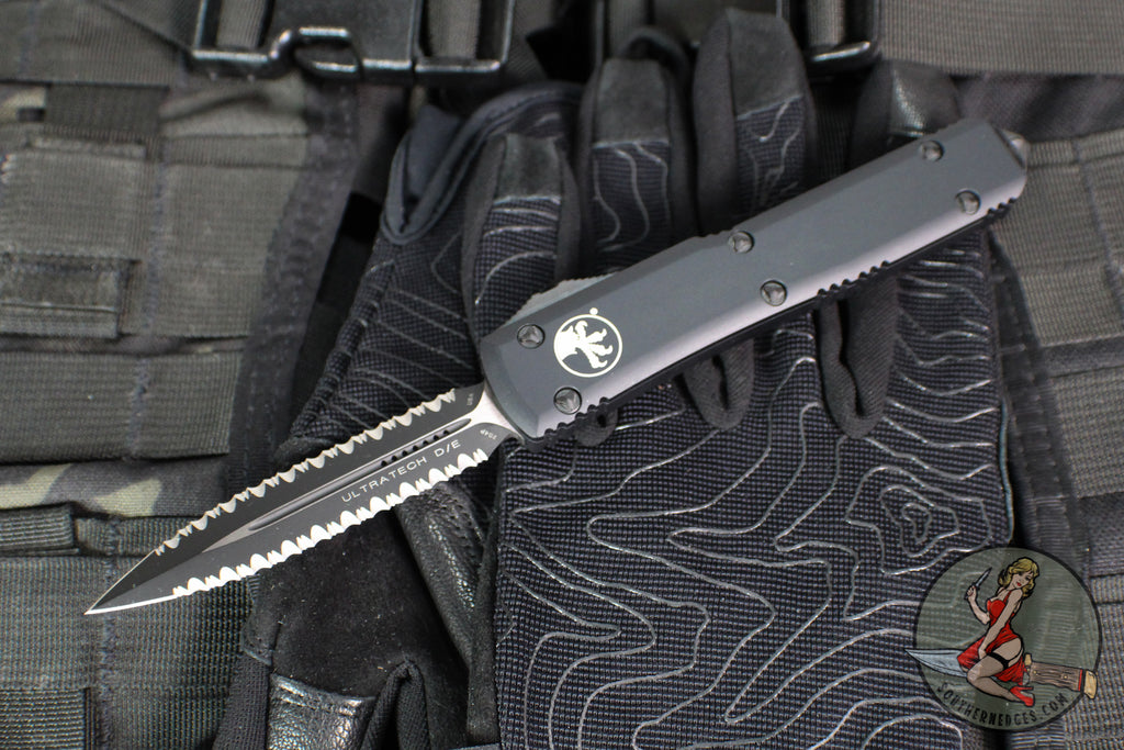Microtech Ultratech OTF Knife- Double Edge- Tactical- Black Handle- Black Double Full Serrated Blade 122-D3 T