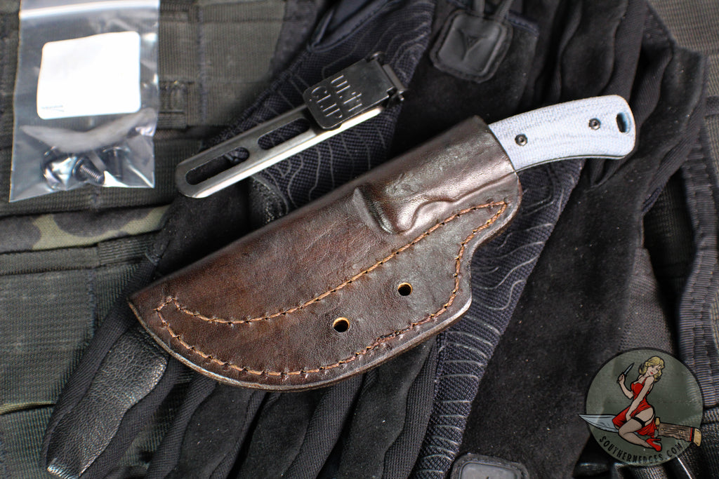 The Tagalong is TRM's newest ultra-compact fixed blade. It is built for everyday use and carry and a reliable knife for a variety of small tasks. Think edc daily, camping, or other outdoor activities. Pancake or Taco Leather sheath included as shown.