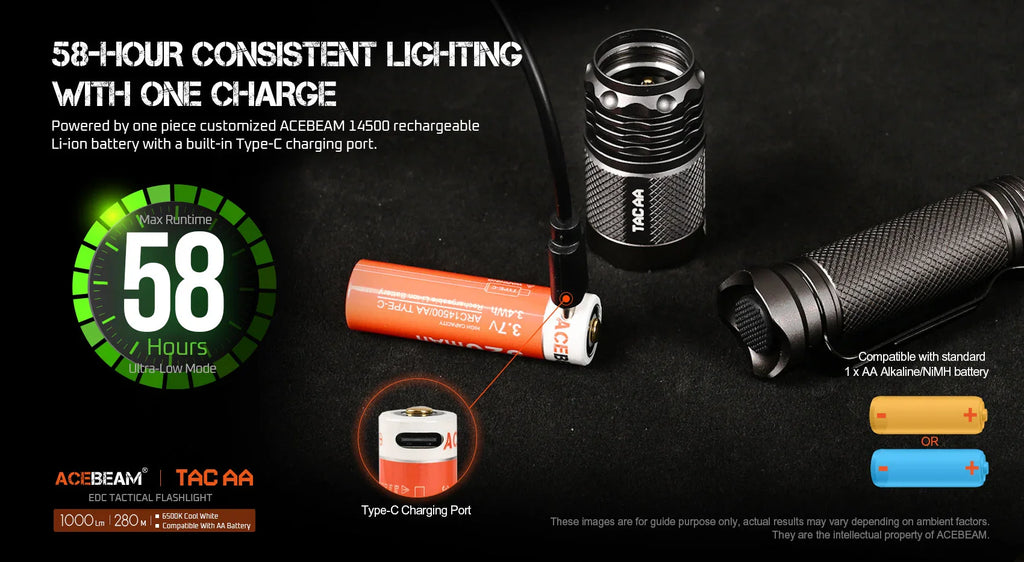 - Featuring a super bright dual-fuel system, the Acebeam TAC AA is powered by an included 14500 USB-C battery, ensuring relentless performance when you need it most. But that's not all - it's also compatible with a standard AA battery, providing you with a reliable backup option for extended missions.