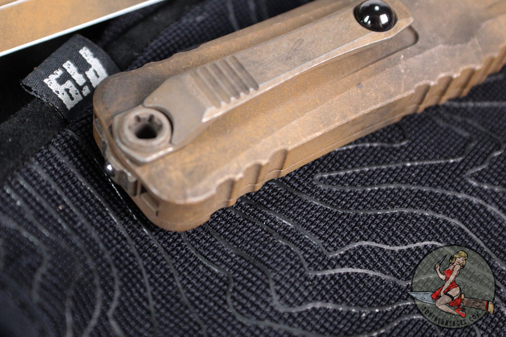 Plague finished Double Edge (D/E) Combat Troodon with special Plague blade finish and standard hardware. Double action Out the Front (OTF) knife. Special Outbreak finished 6061-T6 aluminum handle with M390 steel blade. 3.8" long blade, 9.50" overall tip down carry.