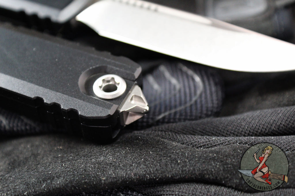 Black finished Single Edge (D/E) UTX-85 with stonewash blade finish. Double action Out the Front (OTF) knife. Black finished 6061-T6 aluminum handle with stonewash finished M390 steel blade.