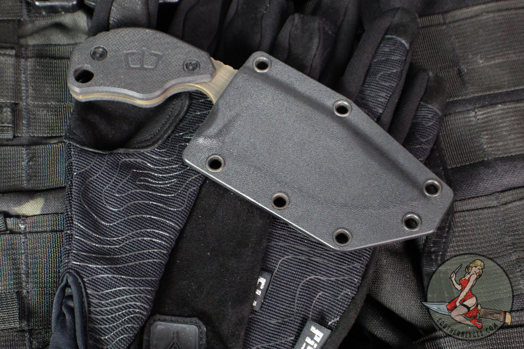 Strider SLCC (slim light concealed carry) with Blackside Customs touches in nicely done Black G-10 handle scales, and special distressed OD Green finished blade and custom sheath.