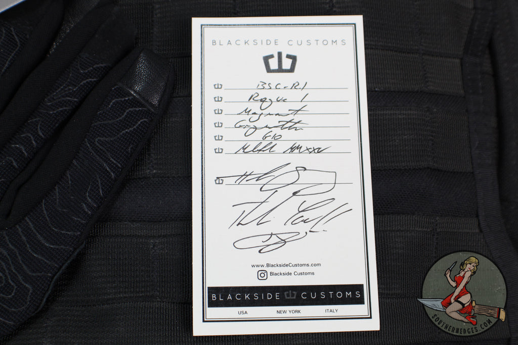 The Rogue 1 is Blackside customs design original fixed blade knife, born from decades of experience in the knife industry. The Rogue 1 is small batched produced and has a Gray Matter finished Magnacut steel blade with Black G-10 scales. Custom detailing everywhere including custom patterned milled scale screws and logo sheath tag. Blackside Customs was born in N.Y. on the outside-the-box thinking and design invested into the highest quality KNIVES, edc gear, tools, and pens made.