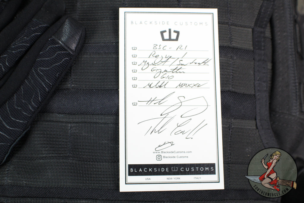 The Rogue 1 is Blackside customs design original fixed blade knife, born from decades of experience in the knife industry. The Rogue 1 is small batched produced and has a Gray Matter finished Magnacut steel blade with Black G-10 scales. Custom detailing everywhere including custom patterned milled scale screws and logo sheath tag. Blackside Customs was born in N.Y. on the outside-the-box thinking and design invested into the highest quality KNIVES, edc gear, tools, and pens made.