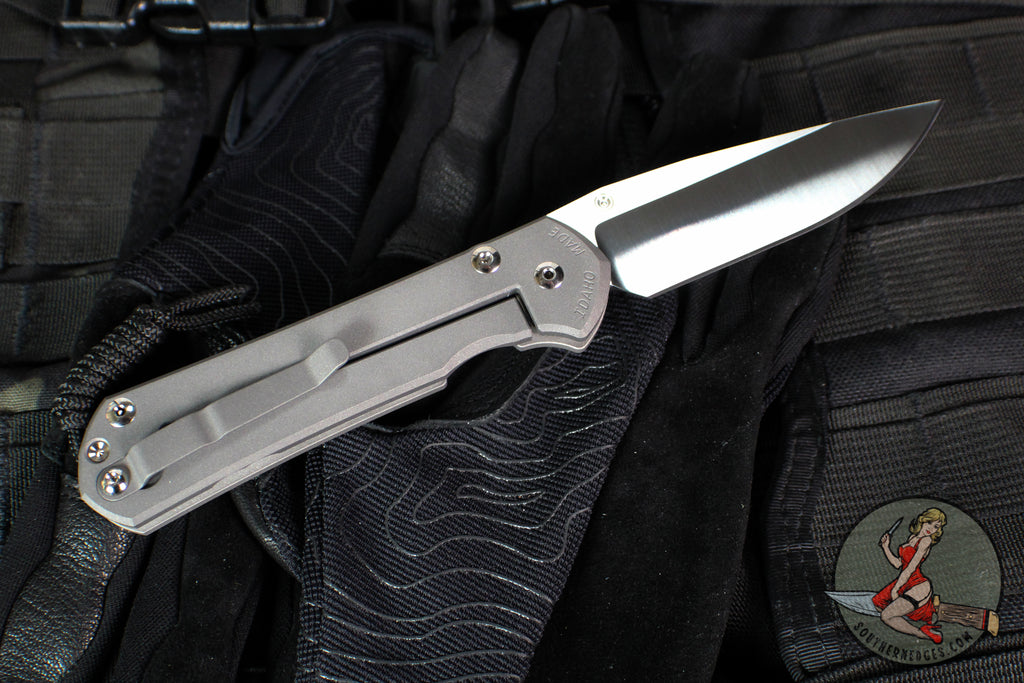 Chris Reeve Classic Sebenza 31 Large Model. Titanium 6AL4V Handle that has been polished on show side and sandblasted to a dark gray color on lock side. Stonewashed drop point blade in Magnacut.