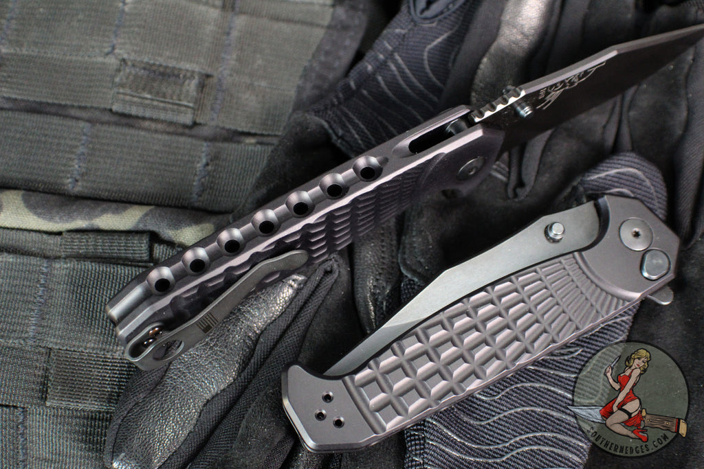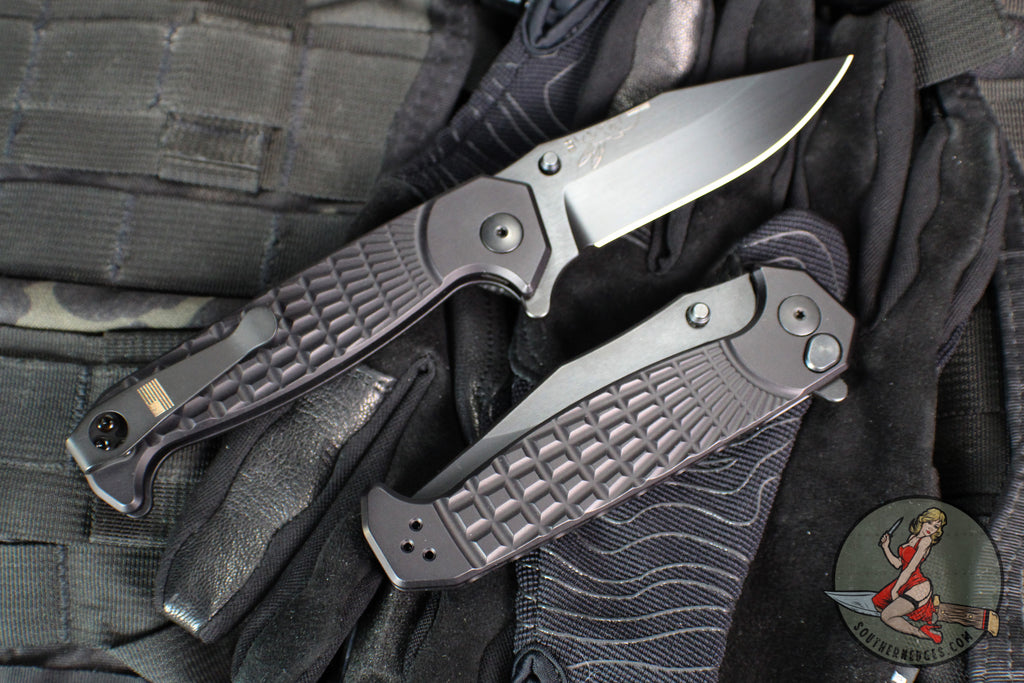 - Model Number: Crow Folder/Flipper- Bitton Lock- Anodized Black Monolithic Aluminum Handle- Grenade Stippled Grip- Black Blade