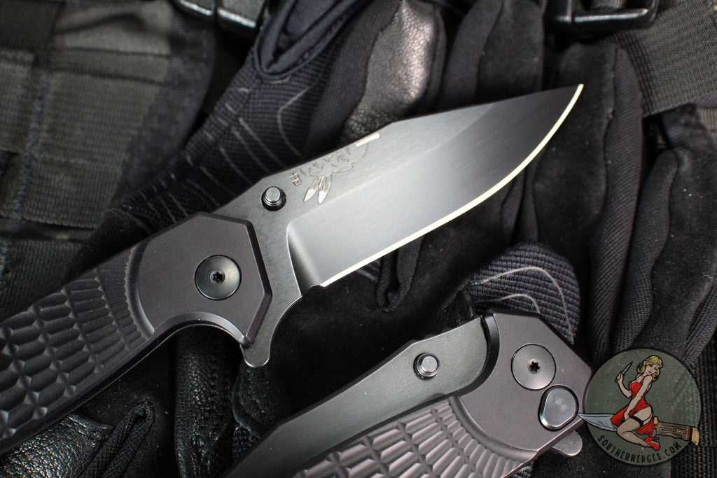 Half Face Blades- Crow Folder/Flipper- Button Lock- Anodized Black Monolithic Aluminum Handle- Grenade Stippled Grip- Black Nitride S35VN Blade