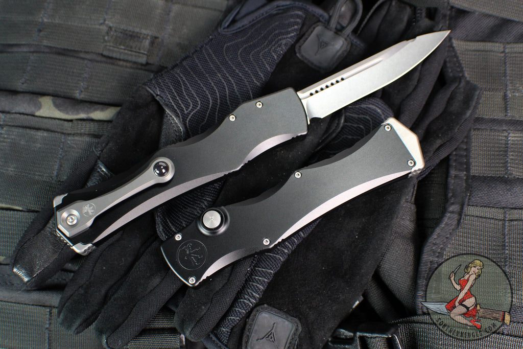 Microtech's Halo IV Single Action model is back and updated. Black Clip Point Out the Front (OTF) knife. Black anodized 6061-T6 aluminum handle with stonewash M390 steel blade.