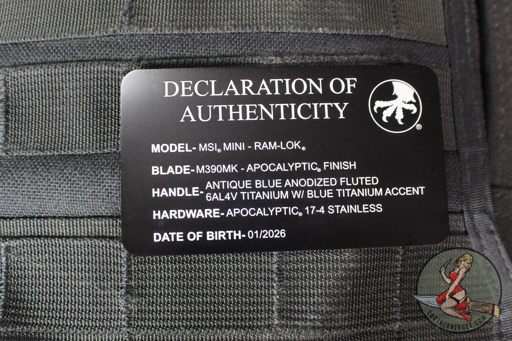 Microtech Knives- M.S.I. Ram-Lok Folder- MINI- Marfione Select- Fluted Antique Blue Finished Titanium Handle- Apocalyptic Plain Edge Blade 210M-10 APFLMS2
