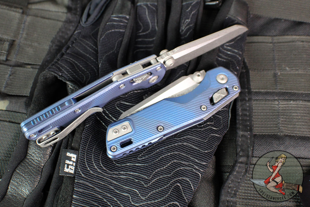 M.S.I. Mini folder with Ram-Lok button lock. Special Fluted Antique Blue Finished Titanium handle- Apocalyptic finished Wharncliffe M390 Blade.