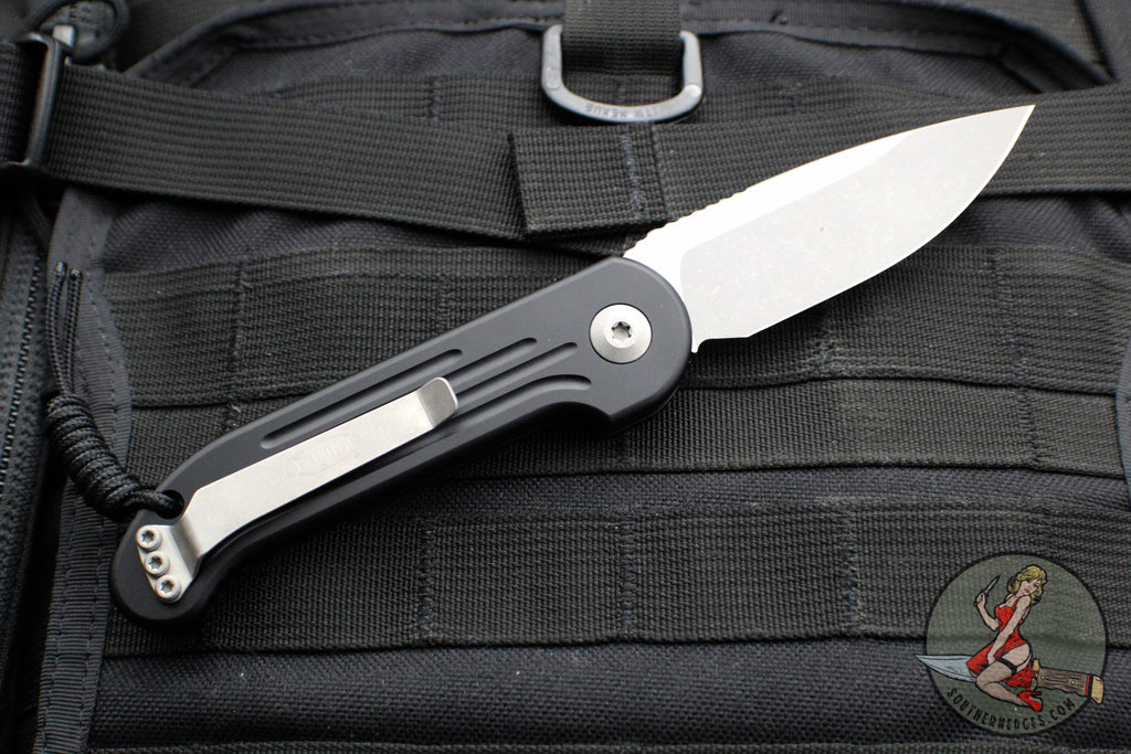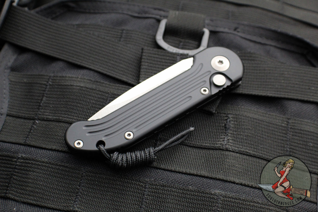 Microtech Black LUDT side-opening knife with apocalyptic finished blade. Black milled aluminum handle with Apocalyptic finished M390 steel blade and hardware. 3.4" blade, 8.0" overall.