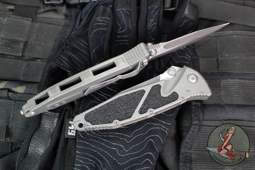 Microtech Single Edge Manual Folder. Natural Clear finished Aluminum Body M390 Steel blade with a apocalyptic blade finish.