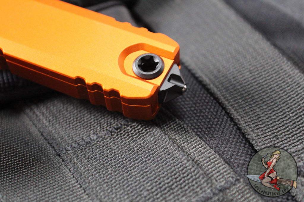 Orange finished Single Edge (S/E) Ultratech with Black blade finish and standard hardware. Double action Out the Front (OTF) knife. Orange finished 6061-T6 aluminum handle with M390 steel blade.