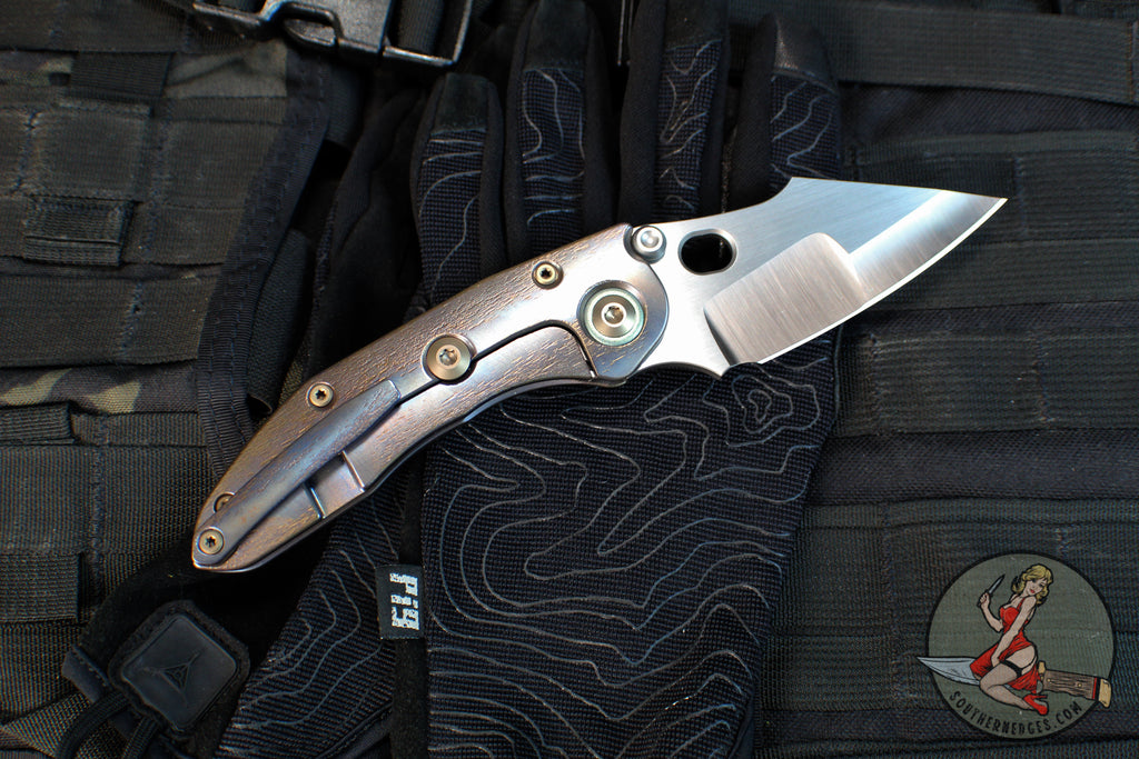Fantastic "Cosmic" Bark textured on these titanium handles and pocket clip. Satin finished 3-1/8" (cutting edge) M390 Steel Blade and hardware. 8-1/2" Overall length. This is a fantastic piece!