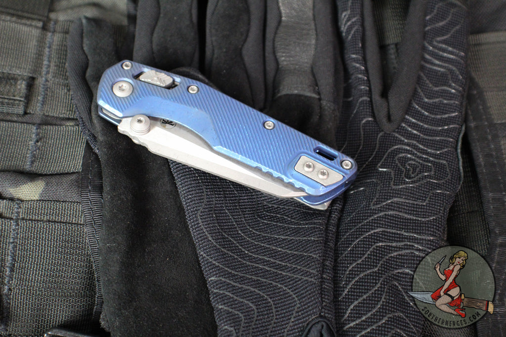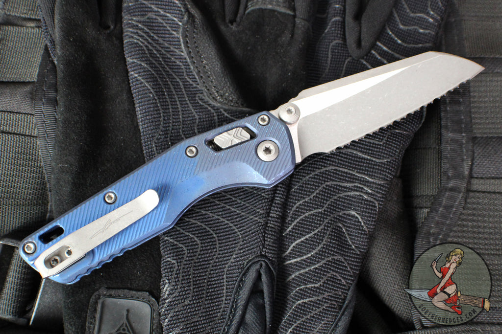 Microtech Knives- M.S.I. Ram-Lok Folder- MINI- Marfione Select- Fluted Antique Blue Finished Titanium Handle- Apocalyptic Full Serrated Edge Blade 210M-12 APFLMS2