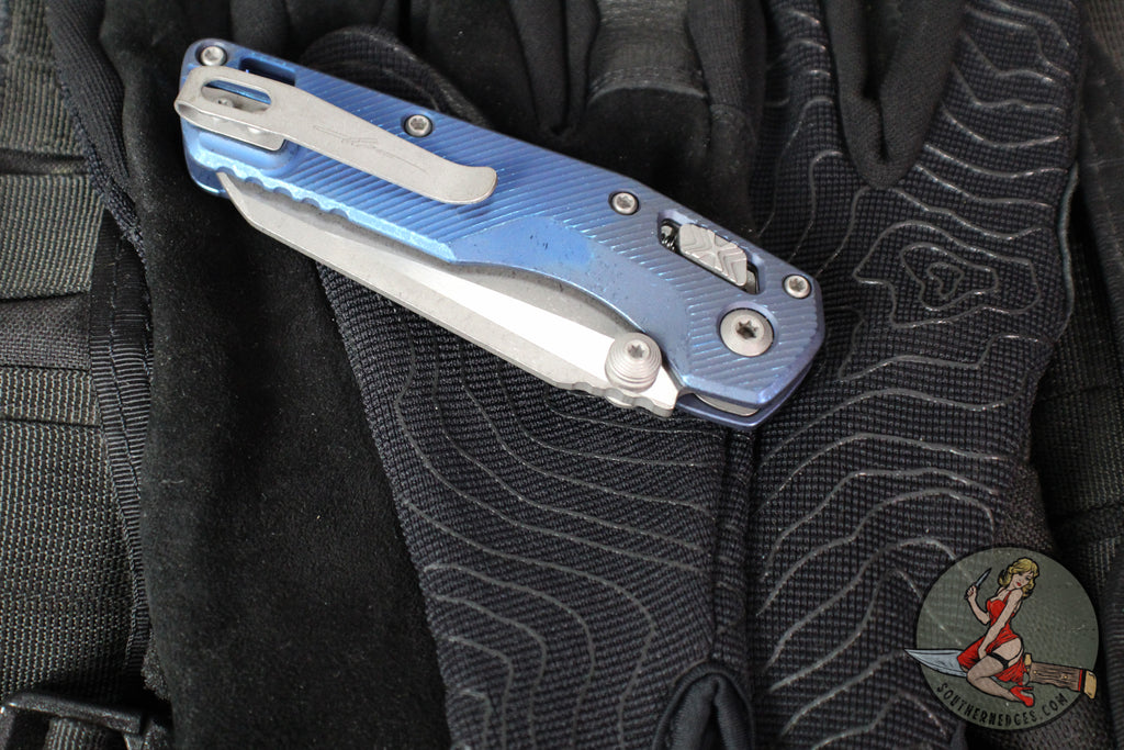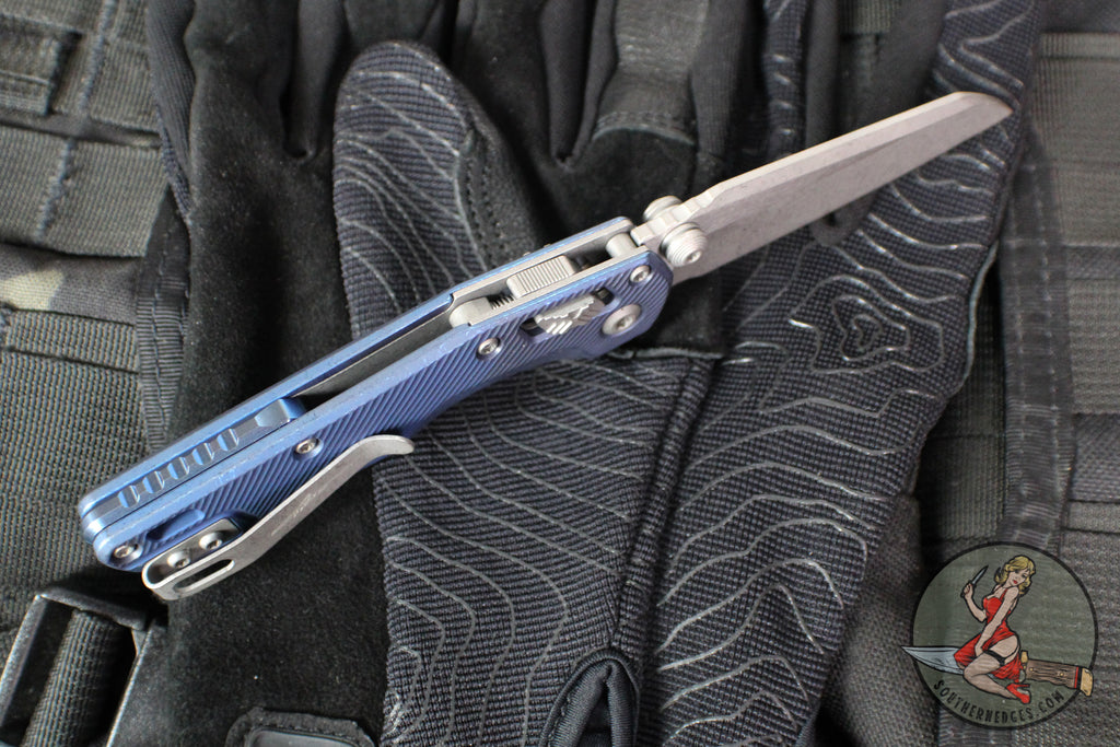 M.S.I. Mini folder with Ram-Lok button lock. Special Fluted Antique Blue Finished Titanium handle- Apocalyptic finished Wharncliffe M390 Blade.