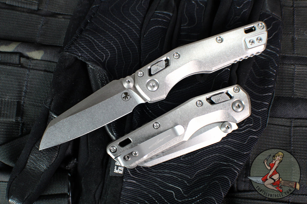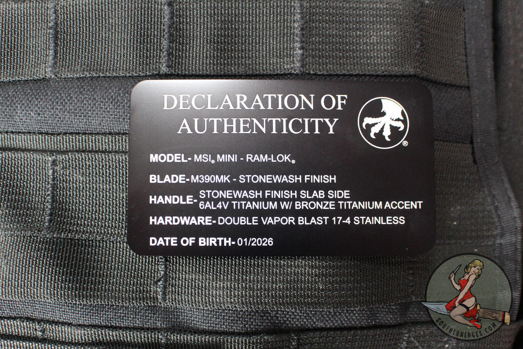 M.S.I. Mini folder with Ram-Lok button lock. Stonewash finished slab-sided smooth Titanium handle. Stonewash finished Wharncliffe M390MK steel blade and Bronze accent.