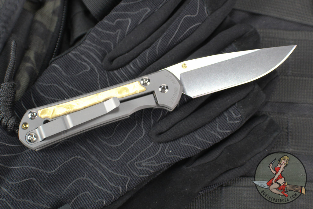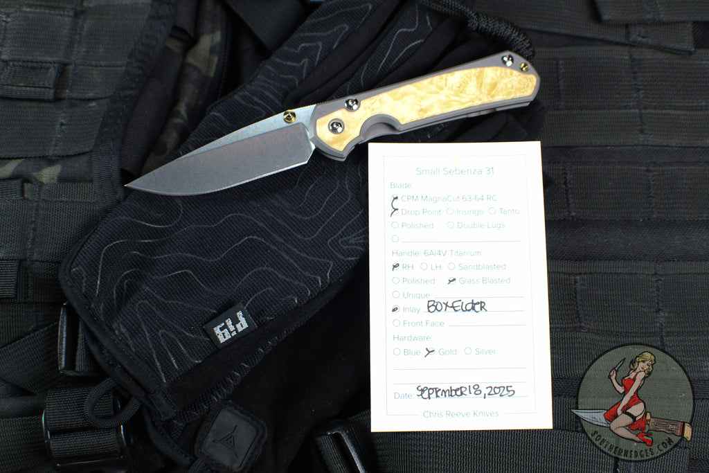 Chris Reeve Classic Sebenza 31 Small Model. Titanium 6AL4V Handle that has been sandblasted to a dark gray color. Box Elder Inlay and Stonewashed drop point blade in Magnacut Steel.