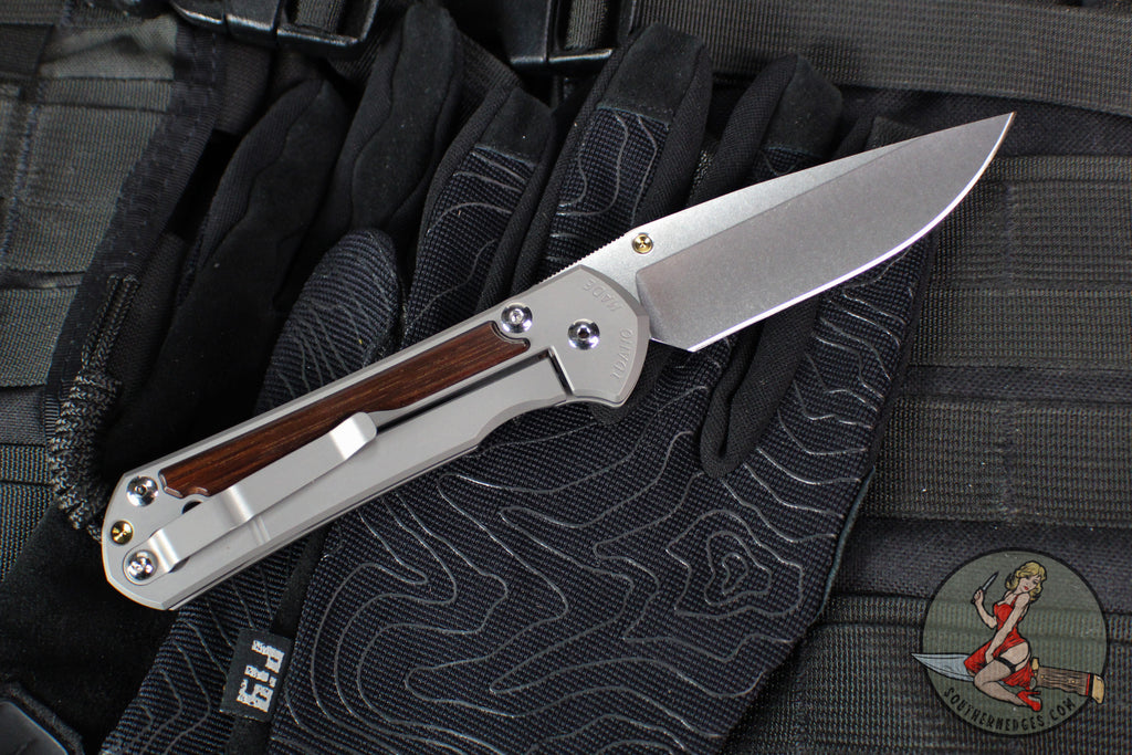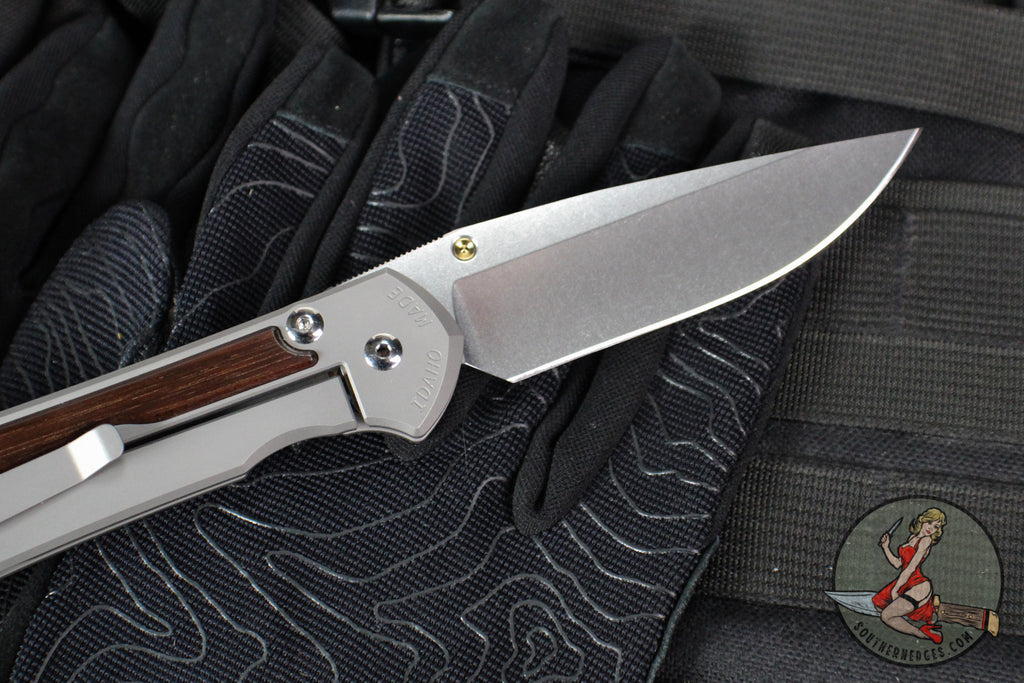 Chris Reeve Classic Sebenza 31 Large Model. Titanium 6AL4V Handle that has been sandblasted to a dark gray color with beautiful Macassar Ebony wood Inlays. Satin drop point blade in MAGNACUT.