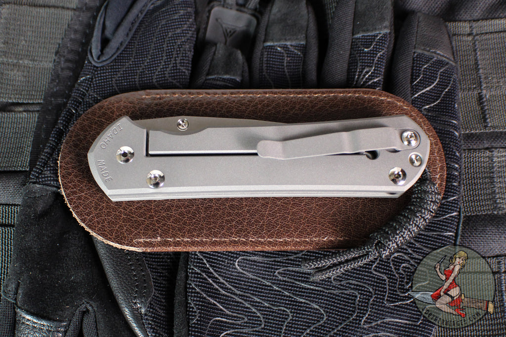 Chris Reeve Classic Sebenza 31 Large Model. Titanium 6AL4V Handle that has been polished on show side and sandblasted to a dark gray color on lock side. Stonewashed drop point blade in Magnacut.