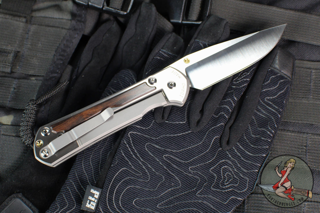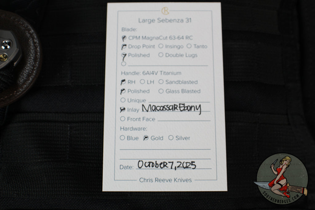Chris Reeve Classic Sebenza 31 Large Model. Titanium 6AL4V Handle that has been Polished to a shiny color with beautiful Macassar Ebony wood Inlays. Polished drop point blade in MAGNACUT.