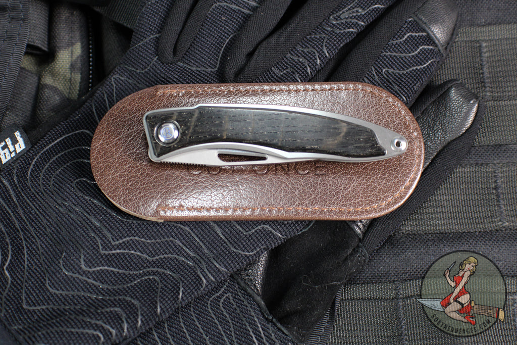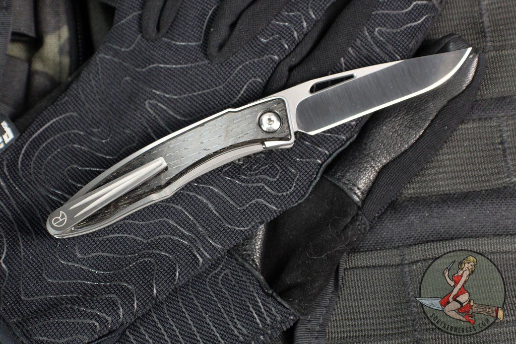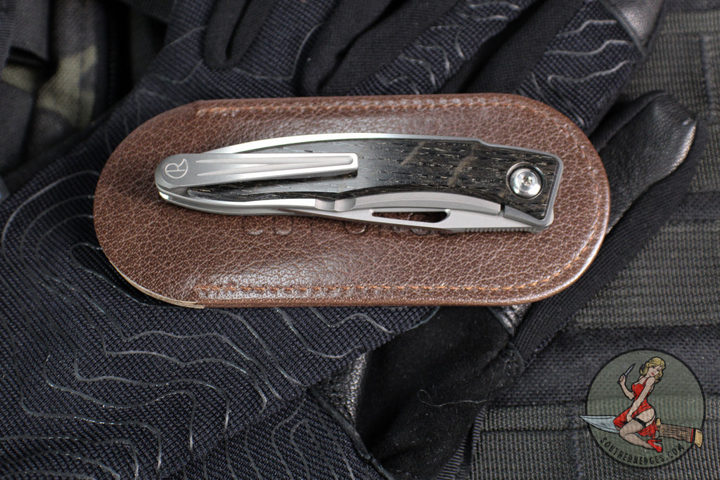 Chris Reeve Mnandi Model, a sleek compact folder perfect for carry. Titanium 6AL4V Handle that has been fully pocketed by Bog Oak Wood. Stonewashed drop point blade in Magnacut steel.