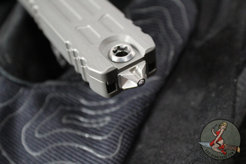 New handle style Natural finished 6061-T6 Aluminum Chassis with Bayonet Edge special Cracked Ice finished M390MK steel blade. This has the new Zero Blade Play updated blade firing mechanism.
