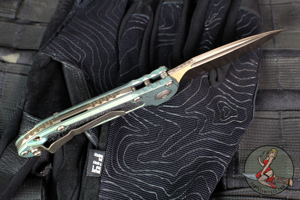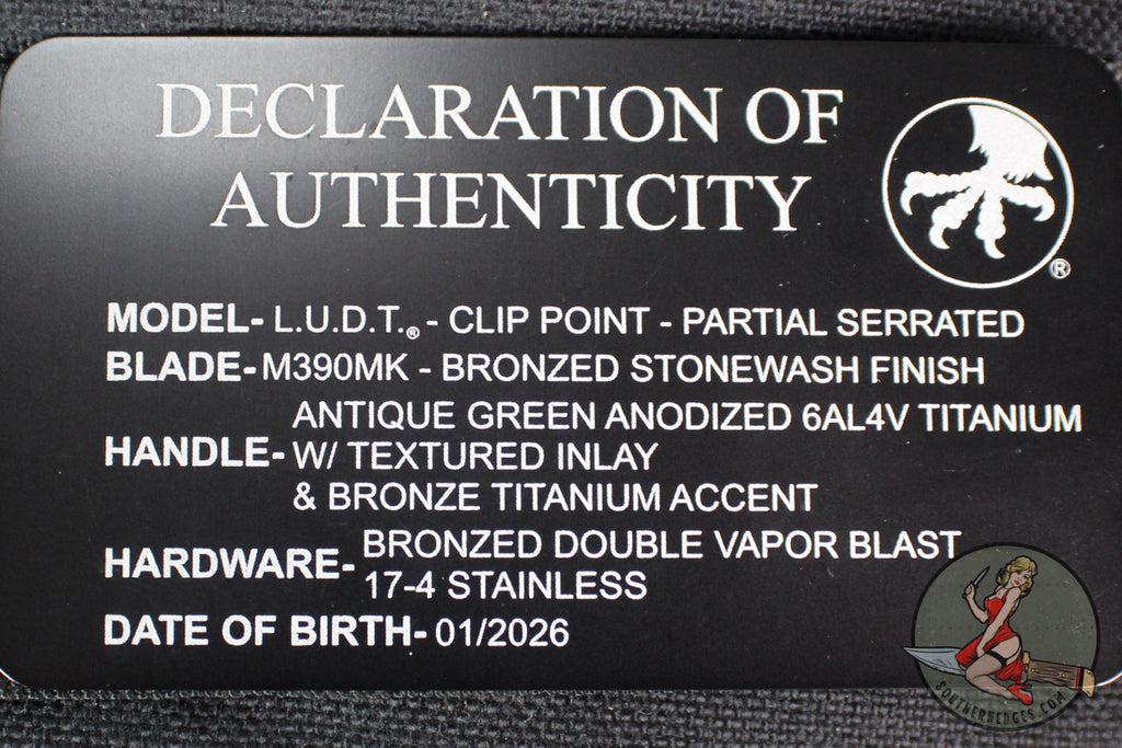 Marfione Select LUDT OTS Knife- Single Edge- Antique Green Anodized Titanium Handle- Textured Inlay- Bronzed Stonewash Part Serrated Edge Blade 1135-14 MS3