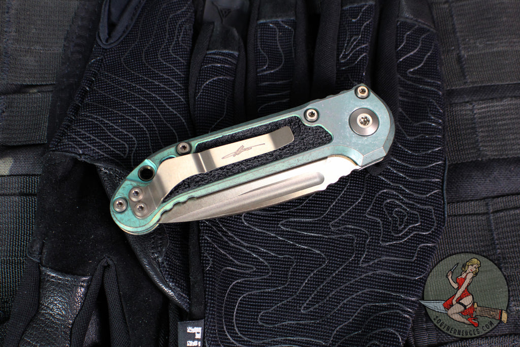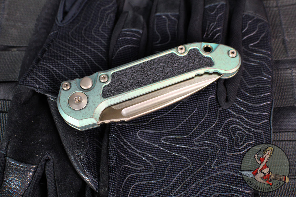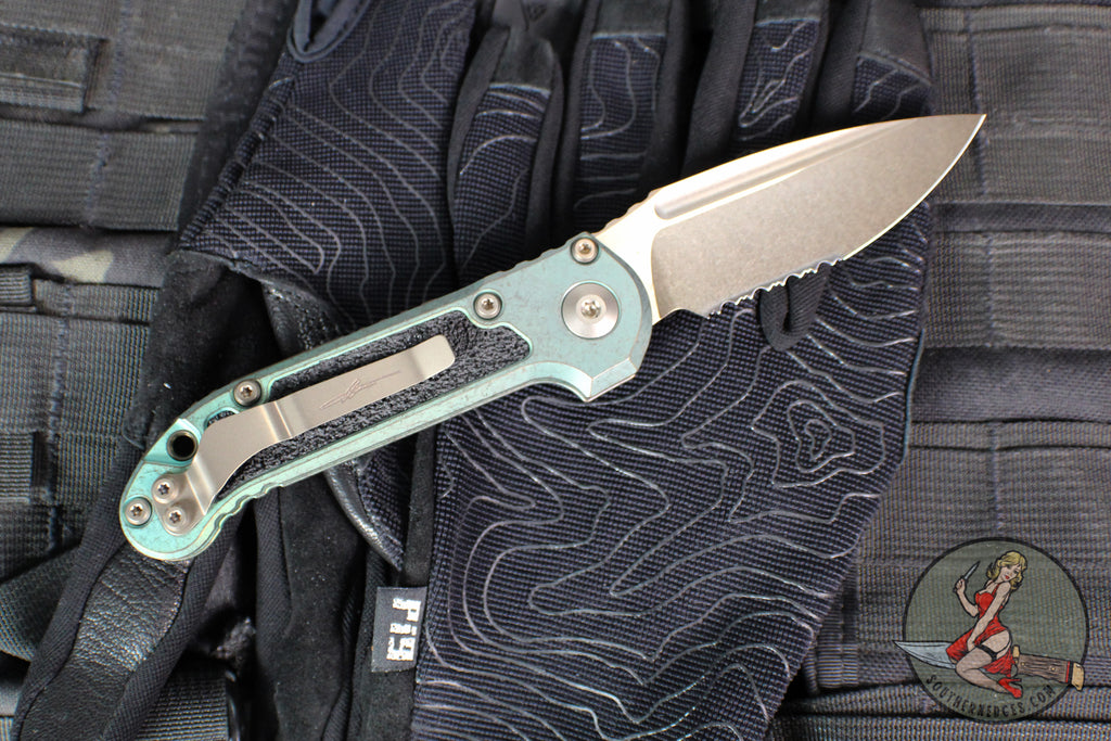 Microtech LUDT side-opening knife with Antique Green Anodized Titanium handle with textured 3M grip tape inlay. This LUDT has a Bronzed stonewash finished M390MK steel part serrated edge blade. Bronze Titanium accent.