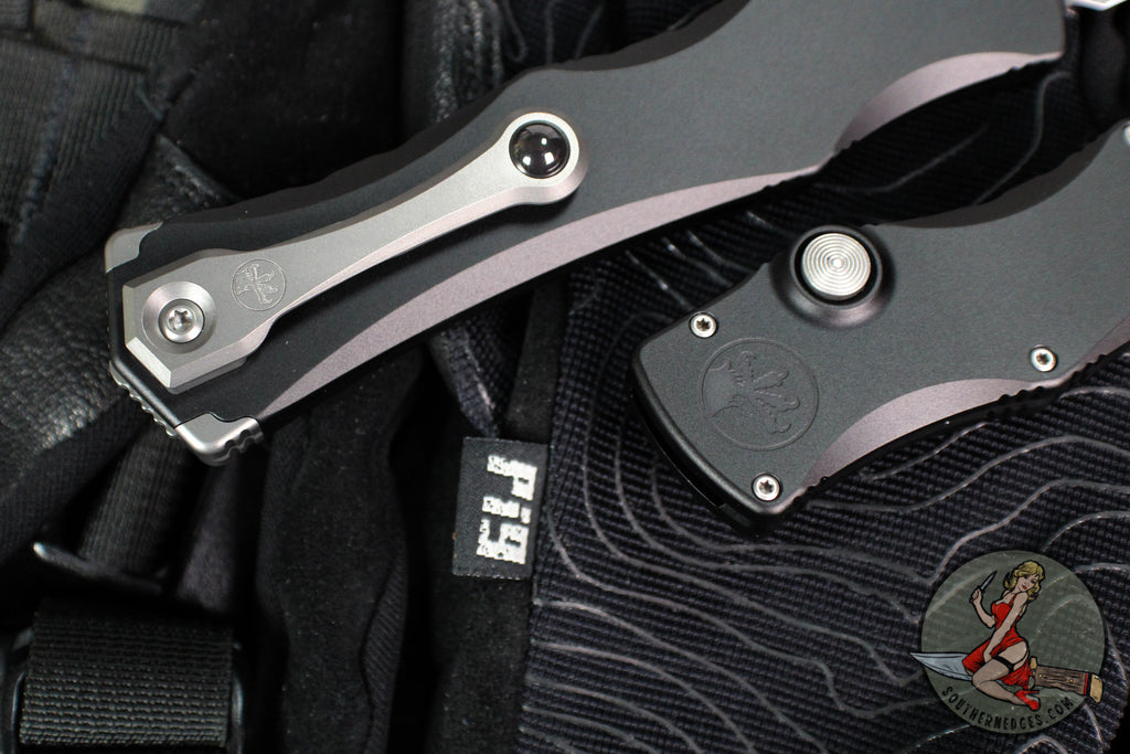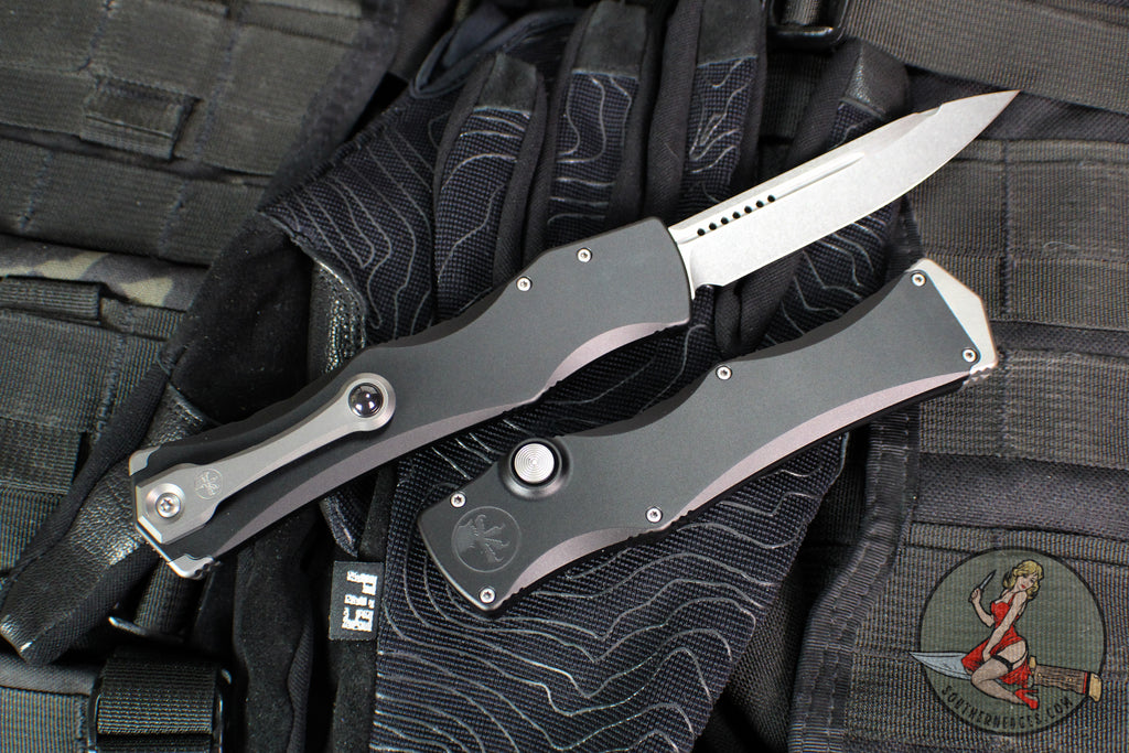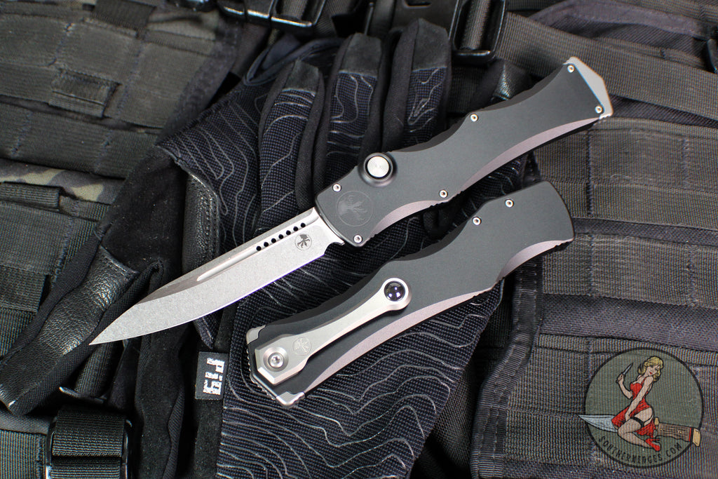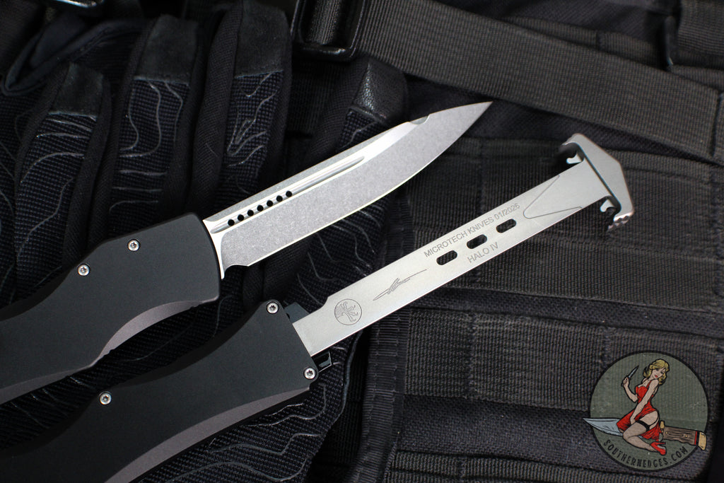 Microtech's Halo IV Single Action model is back and updated. Black Clip Point Out the Front (OTF) knife. Black anodized 6061-T6 aluminum handle with stonewash M390 steel blade.