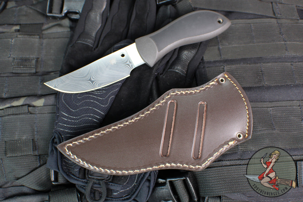 The Spyderco Moran is a medium sized fixed blade knife designed by Bill Moran as the 30th Anniversary of the legendary design. The handle is Gray/Black FRN with a Damasteel blade. Leather Sheath.