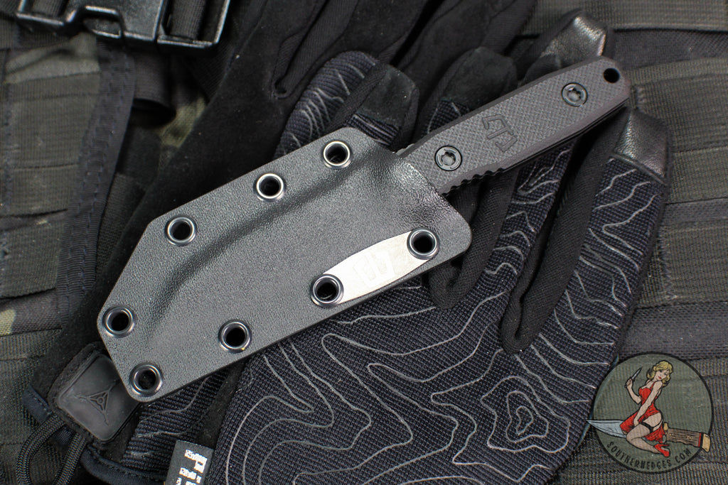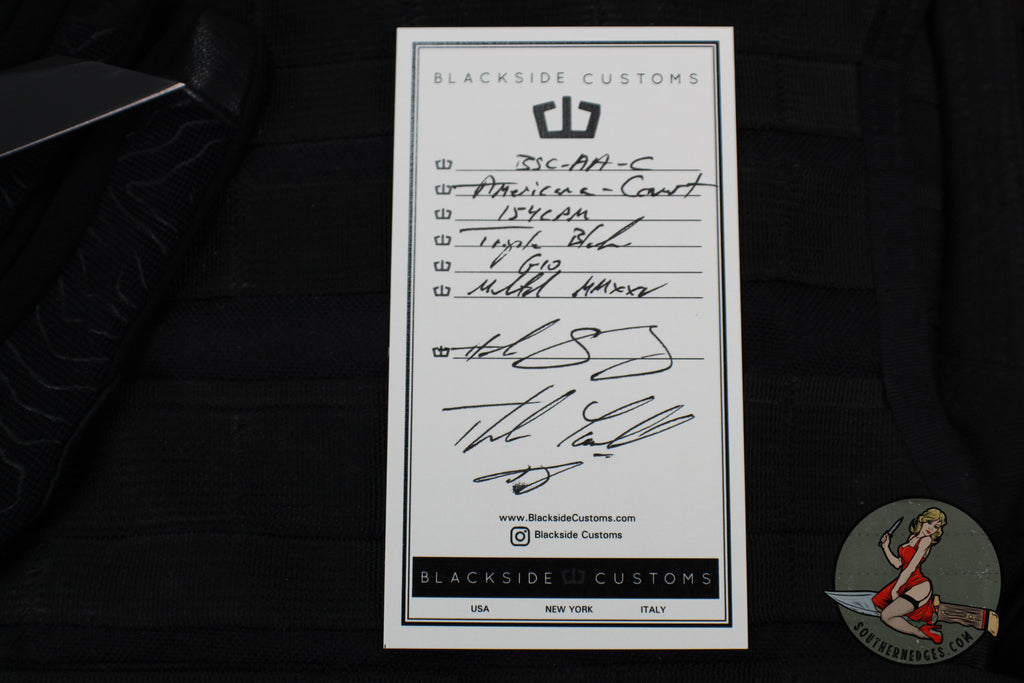 The Americana Covert model is Blackside Customs forward thinking fixed blade design shrunk down for covert edc carry and born from decades of experience in the knife industry. The Americana Covert is small batched produced and has a modern Reverse Tanto edged Black Cerakoted finished 154 CPM steel blade with Black G-10 scales. Custom detailing everywhere including custom patterned milled scale screws and logo sheath tag. Blackside Customs was born in N.Y. on the outside-the-box thinking and design invested into the highest quality KNIVES, edc gear, tools, and pens made.