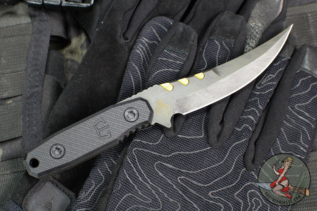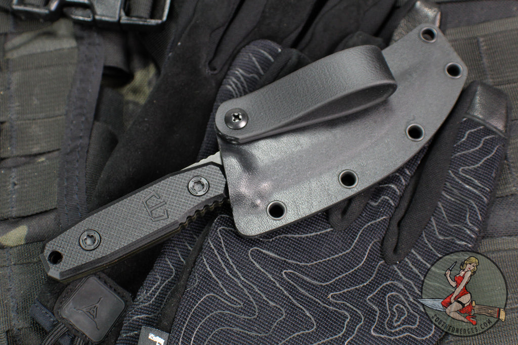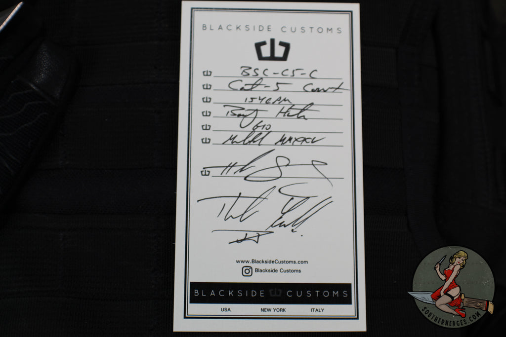 The Cat 5 Covert Model is Blackside Customs forward thinking fixed blade design manifested in an edc Persian, born from decades of experience in the knife industry. The Cat 5 Covert is small batched produced and has a modern Persian Bounty Hunter finished 154 CPM steel blade with Black G-10 scales. Custom detailing everywhere including custom patterned milled scale screws and logo sheath tag. Blackside Customs was born in N.Y. on the outside-the-box thinking and design invested into the highest quality KNIVES, edc gear, tools, and pens made.
