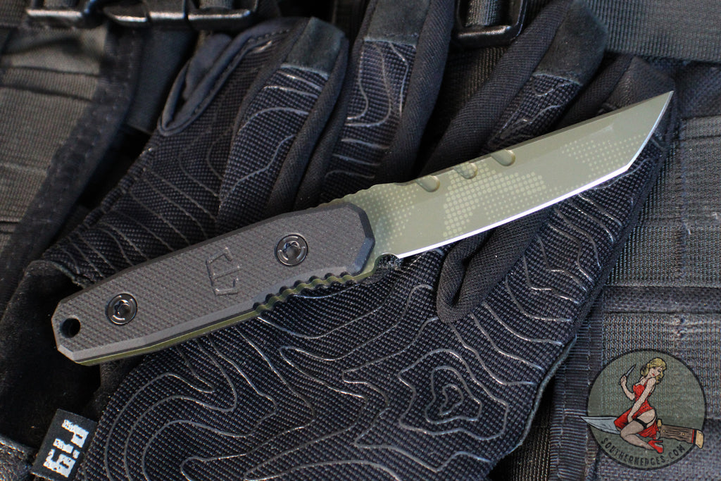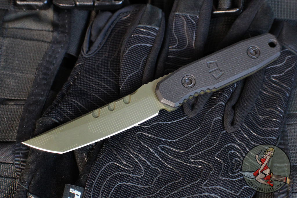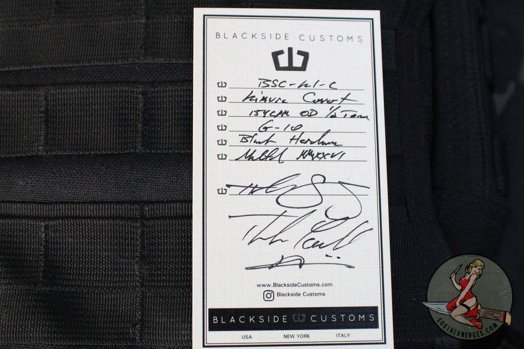 The Kimura Covert is a Blackside customs fixed blade knife model shrunk down from the original Kimura Model, born from decades of experience in the knife industry. The Kimura Covert is small batched produced and has a Tanto Half Tone Green Camo Cerakoted 154 CPM steel blade with Black G-10 scales. Custom detailing everywhere including custom patterned milled scale screws and logo sheath tag. Blackside Customs was born in N.Y. on the outside-the-box thinking and design invested into the highest quality KNIVES, edc gear, tools, and pens made.