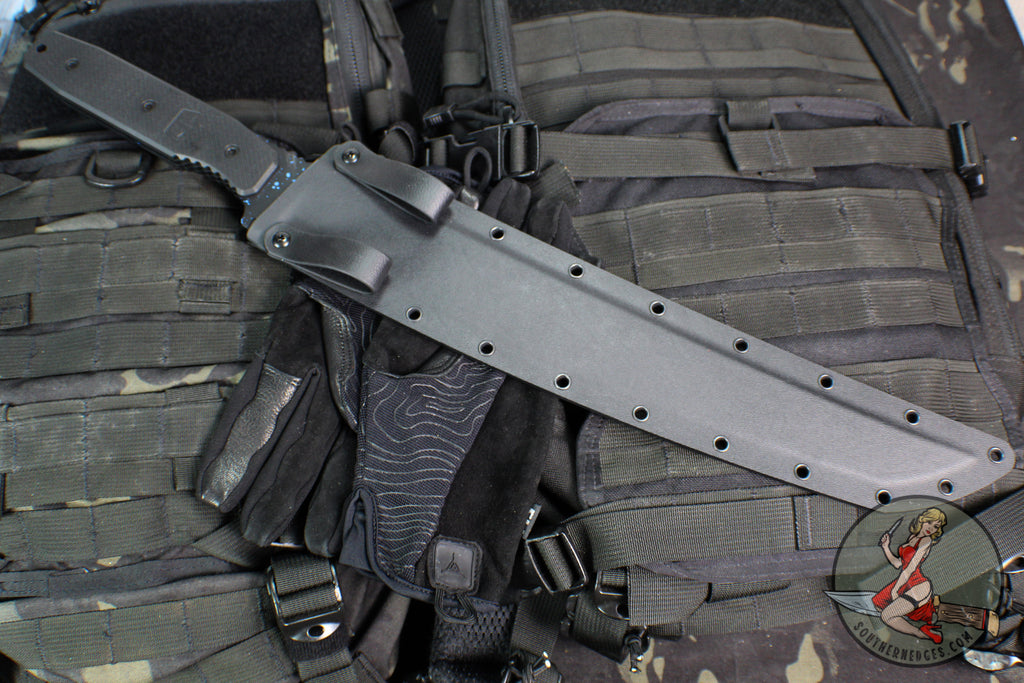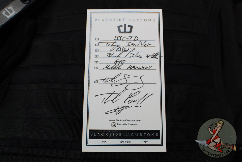 The Tokyo Drifter is Blackside customs newest fixed blade, born from decades of experience in the knife industry. The Tokyo Drifter Wakizashi is small batched produced and has a Tanto Blue Spattered Black Cerakoted PSB27 steel blade with Black G-10 scales. Custom detailing everywhere including custom patterned milled scale screws and logo sheath tag. Blackside Customs was born in N.Y. on the outside-the-box thinking and design invested into the highest quality KNIVES, edc gear, tools, and pens made.