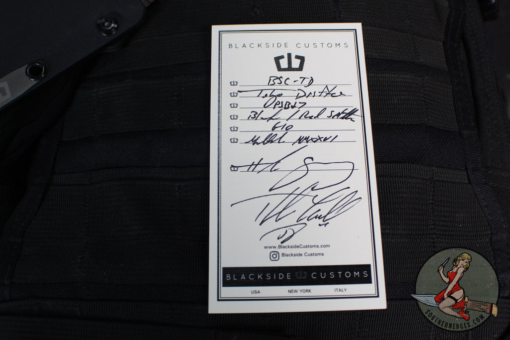 The Tokyo Drifter is Blackside customs newest fixed blade, born from decades of experience in the knife industry. The Tokyo Drifter Wakizashi is small batched produced and has a Tanto Red Spattered Black Cerakoted PSB27 steel blade with Black G-10 scales. Custom detailing everywhere including custom patterned milled scale screws and logo sheath tag. Blackside Customs was born in N.Y. on the outside-the-box thinking and design invested into the highest quality KNIVES, edc gear, tools, and pens made.