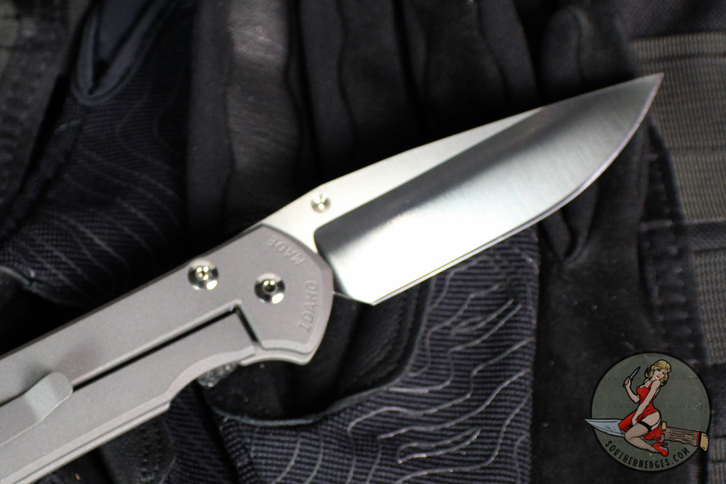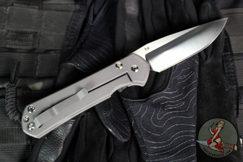 Chris Reeve Classic Sebenza 31 Large Model. Titanium 6AL4V Handle that has been polished on show side and sandblasted to a dark gray color on lock side. Stonewashed drop point blade in Magnacut.