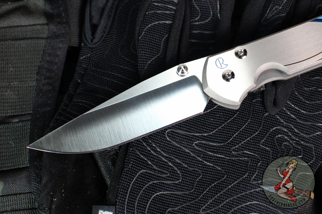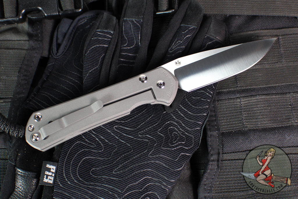 Chris Reeve Classic Sebenza 31 Large Model. Titanium 6AL4V Handle that has been polished on show side and sandblasted to a dark gray color on lock side. Stonewashed drop point blade in Magnacut.