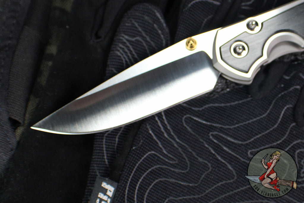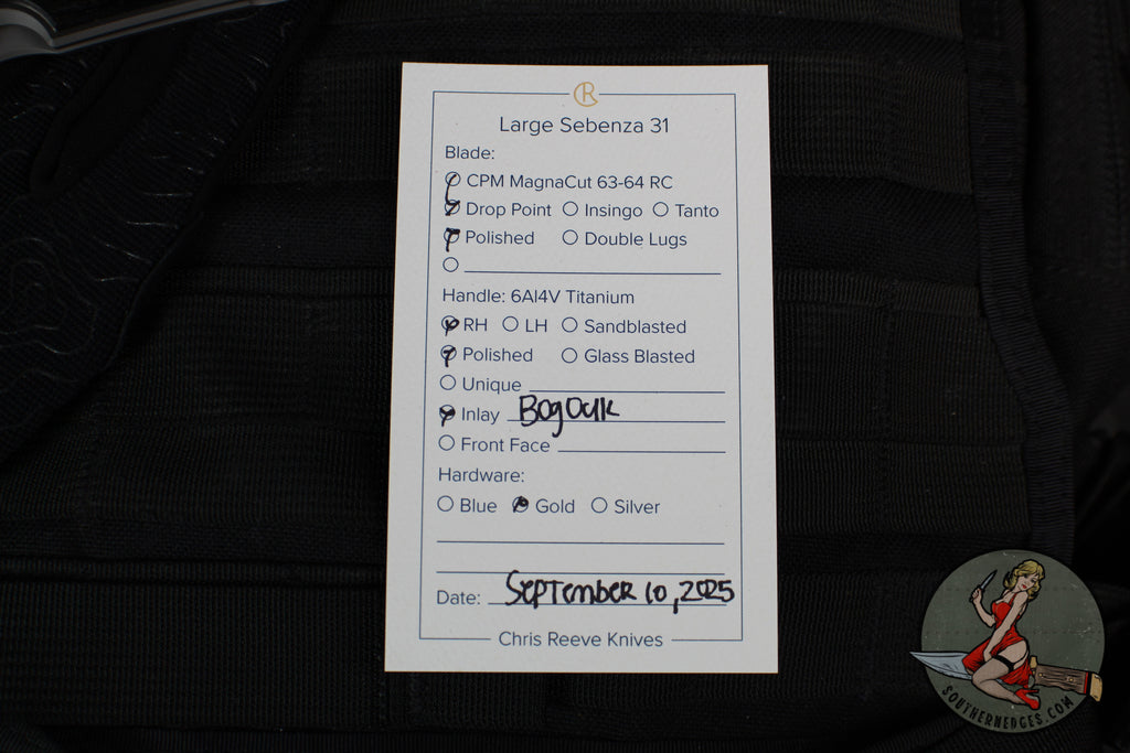 Chris Reeve Classic Sebenza 31 Large Model. Titanium 6AL4V Handle that has been Polished to a beautiful shine and has beautiful Bog Oak wood Inlays. Polished drop point blade in MAGNACUT.