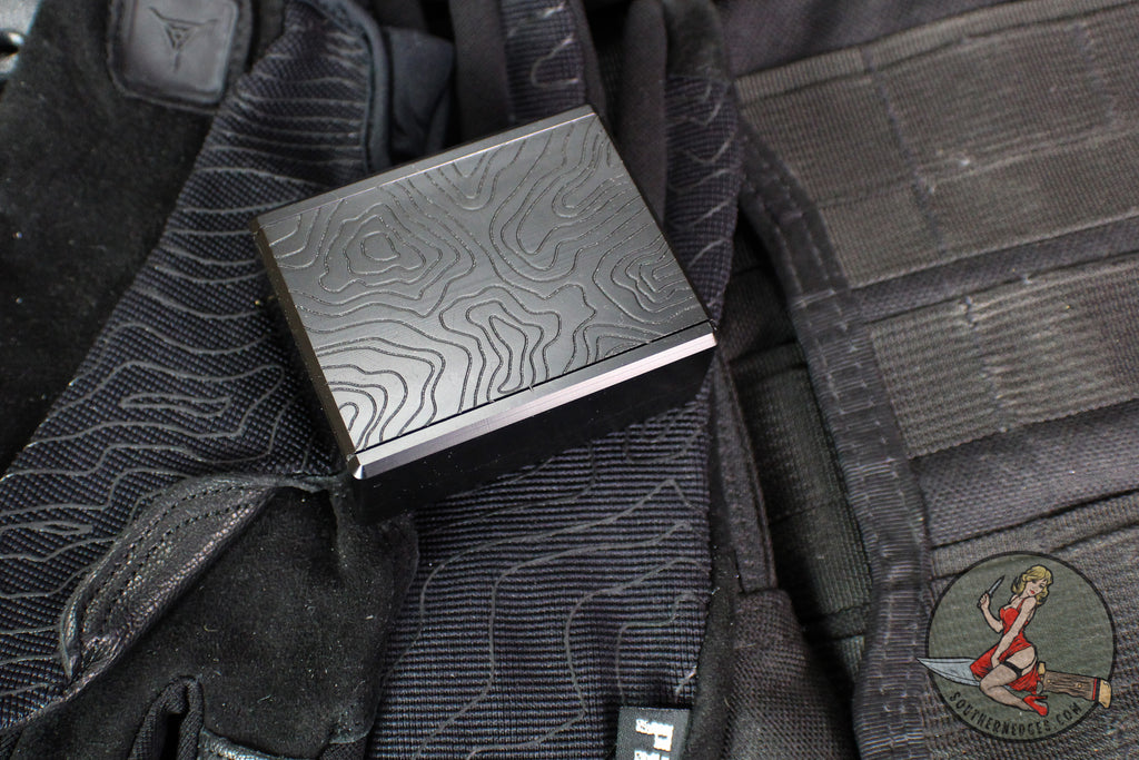 County Comm Delrin Pocket Storage Strong Box with slide top. Laser engraved topo pattern and great for edc carry of smaller items.