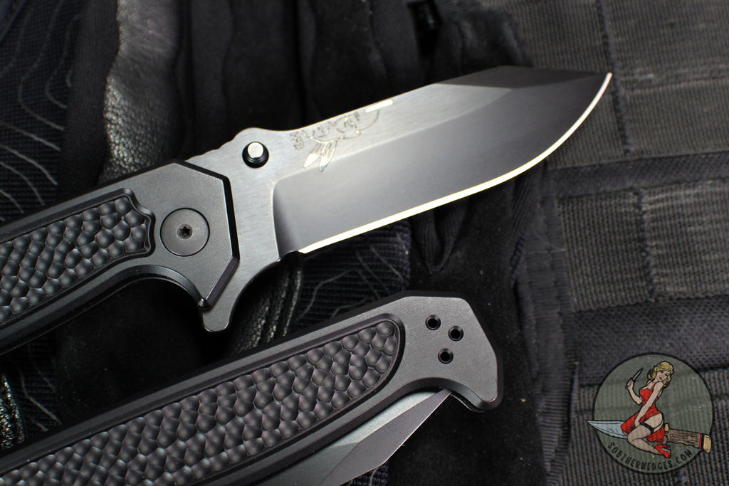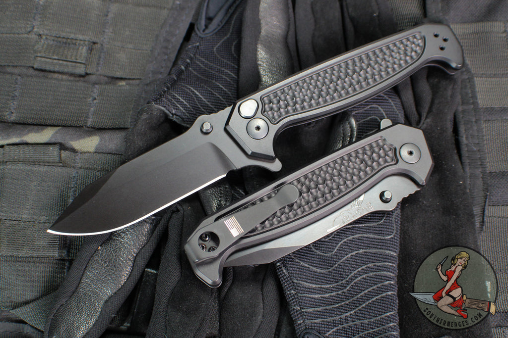 Half Face Blades- Disaster Folder/Flipper- Button Lock- Anodized Black Monolithic Aluminum Handle- Dimpled Grip- Black Nitride S45VN Blade- Deep Carry Clip