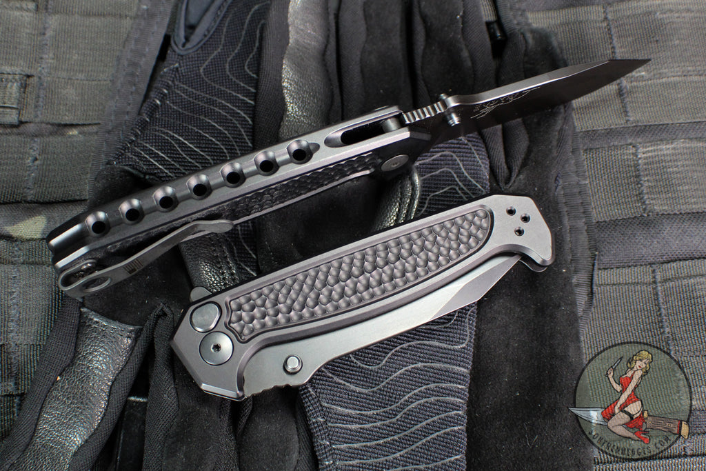 - Model Number: Disaster Folder/Flipper- Button Lock- Anodized Black Monolithic Aluminum Handle- Dimpled Grip- Black Nitride S45VN Blade