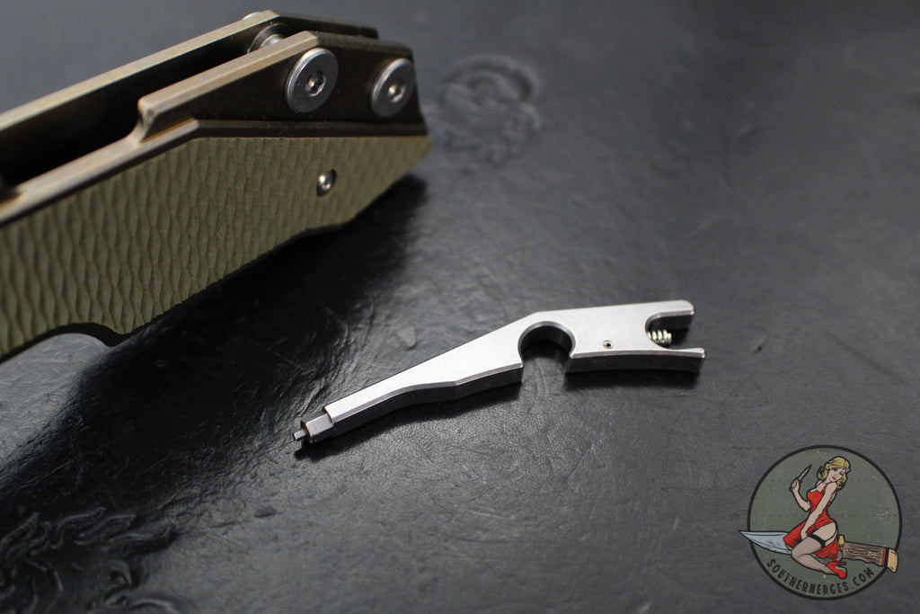 The Fulltrack Spanto model from Hinderer Knives. A bigger brother to the Fulltrack, and equally indestructible as all Hinderer knives are known to be. Fully integrated, and removable back-spacer knife tool.