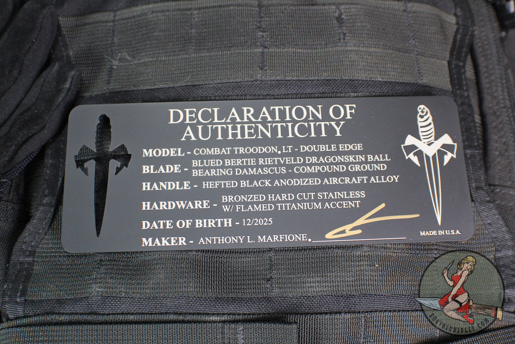 Marfione Custom Combat Troodon- Gen III- Double Edge- Black Deep Engraved Chassis- Blued Bertie Reitveld Dragonskin Ball Bearing Damascus Compound Ground Blade 1142-16 BRBLKBZFL-MCK