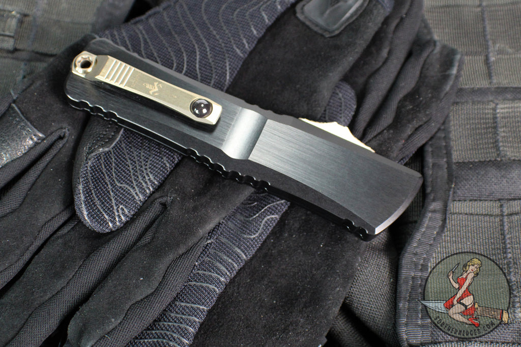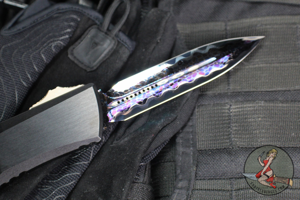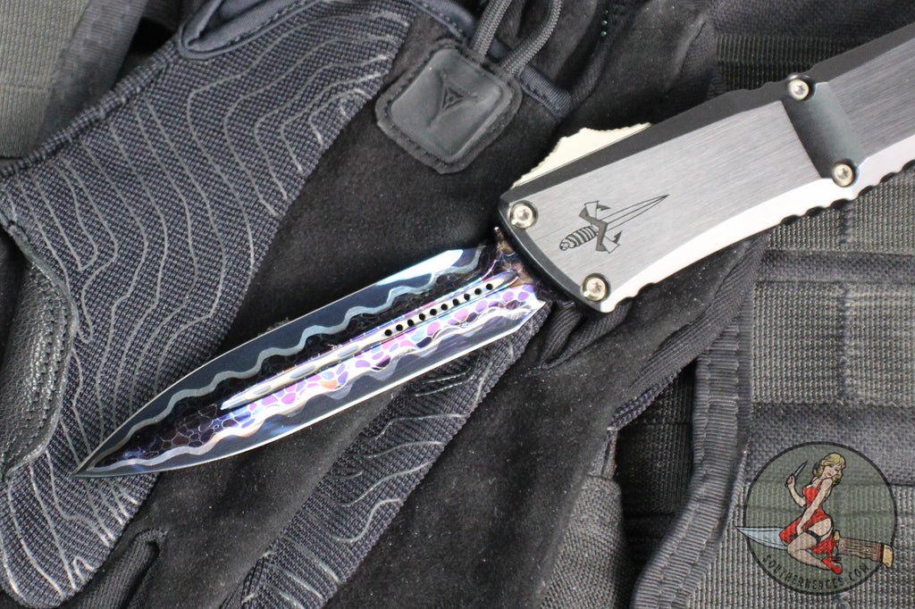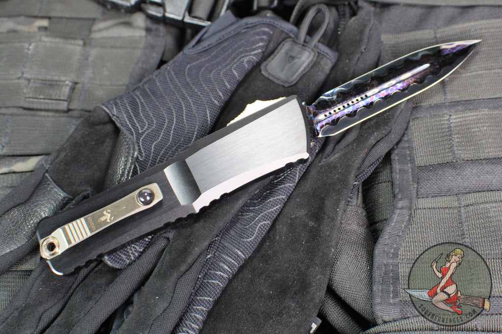 Marfione Custom Combat Troodon. Double Edge (D/E) Blade profile with M390 steel Mirror Polished blade. Blue Chip Hardware on this great knife. Double action Out the Front (OTF) knife. Black anodized 6061-T6 aluminum handle has deep logo engraved.